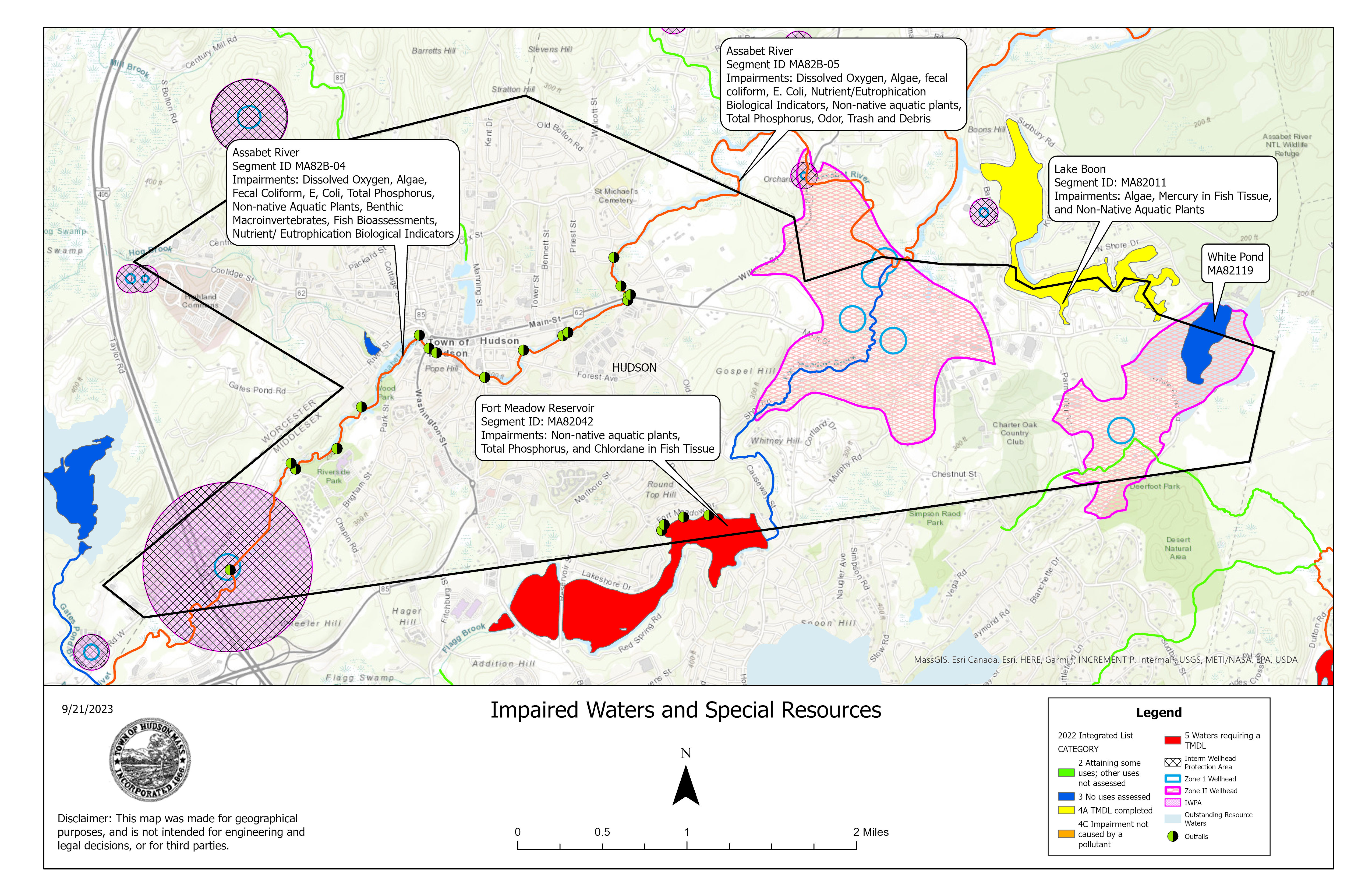 According to the latest Integrated List of Waters 303(d) list as developed by the Department of Environmental Protection (DEP), some waterways within the Town of Hudson are impaired (polluted). Discharges to impaired water bodies amplify the MCMs by requiring additional documents, reports, and educational requirements. Impaired water bodies in Hudson are Lake Boon, Fort Meadow Reservoir, and the Assabet River.