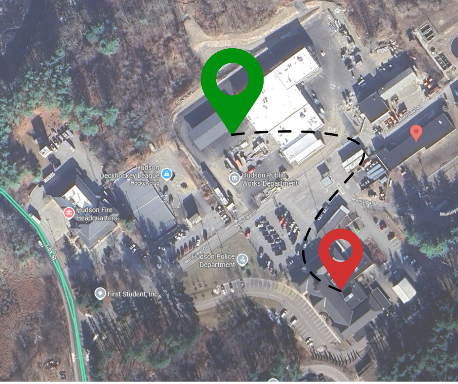 We're now (mostly) in the new building, so be sure to head across the parking lot to the new facility for all your DPW needs. Though, there is signage on our old door should you forget OR have missed this post😀Thank you for your patience and understanding through this transition period! (Image below shows 1 Municipal Drive lot, red marker indicates Police Headquarters/old DPW office, green marker indicates new DPW building, dotted black line connecting the two locations)