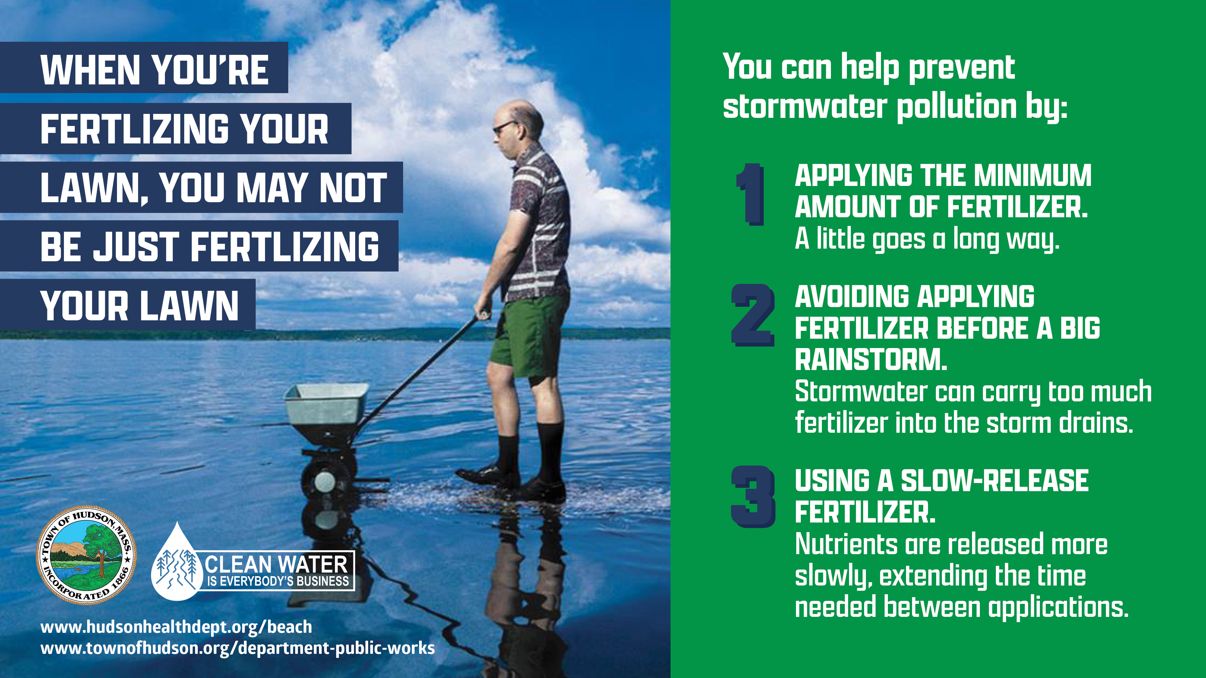The Town posts some messages to the DPW Facebook Page and within inserts to certain bills. In 2024, the Stormwater Division created a graphic that was added to the Consumer Confidence Report. For general stormwater questions, review our Stormwater and Stormwater Utility FAQ Document (PDF). All other educational materials can be found on this page.