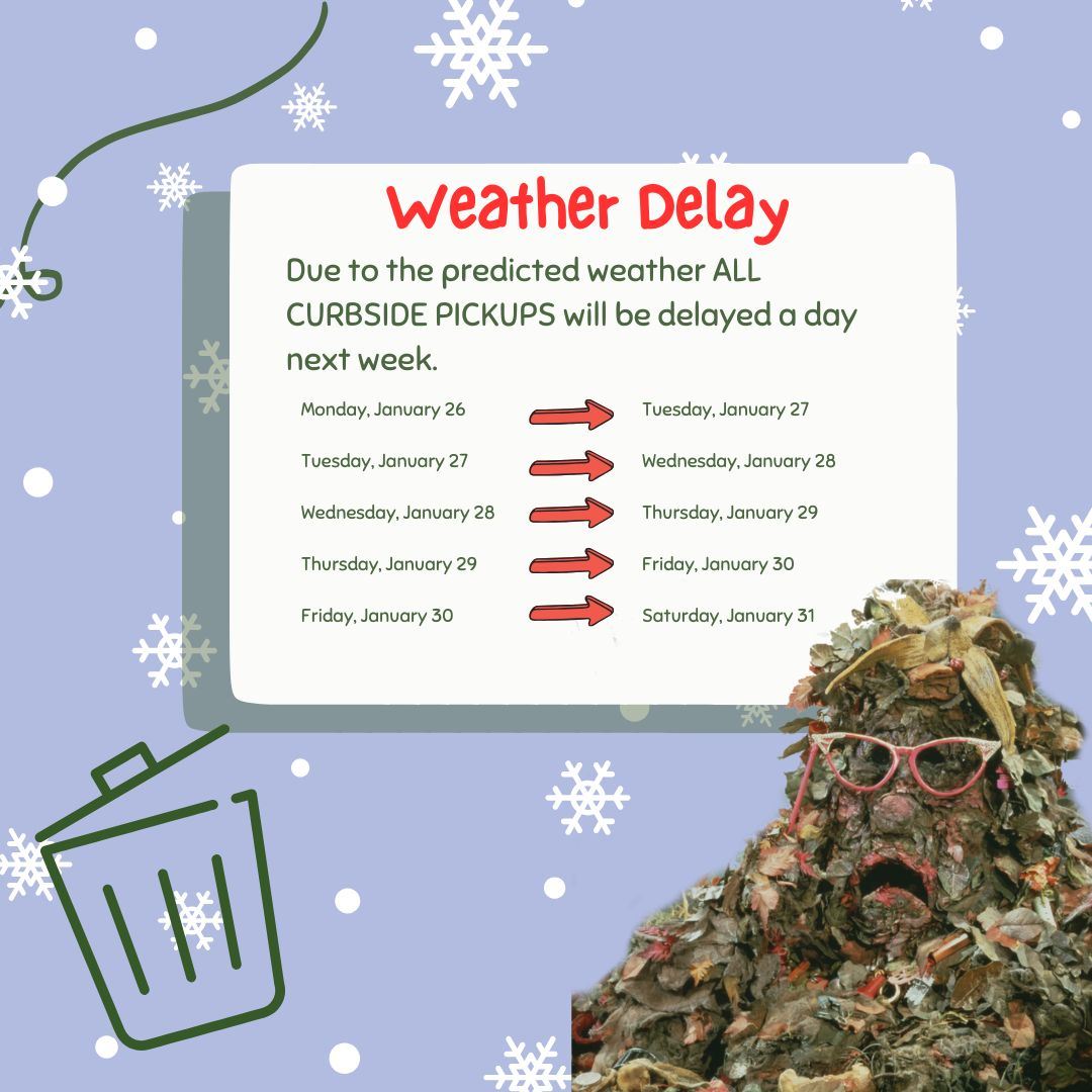 ⚠♻️Town-wide Curbside Trash Pickup Delay♻️⚠Due to the upcoming snowstorm, Trash & Recycling pick up for the week of Jan 26-30 will be placed into a Holiday week schedule.What does this mean? Monday's pickup will move to Tuesday, Tuesday moves to Wednesday, Wednesday moves to Thursday, Thursday moves to Friday, Friday moves to Saturday. We ask that all bins are removed from roadside, as to not be an obstacle for our plows.Stay safe and warm this weekend!